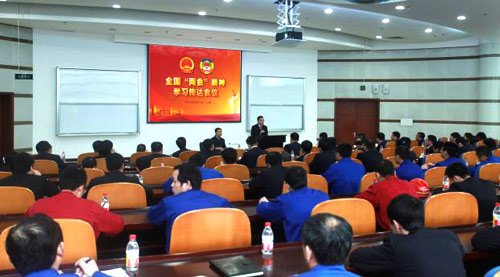 李新炎主席在报告会上介绍,今年的“全国两会”是换届的大会,尽管会议议程较多,但时间安排特别紧凑,自始至终体现着习近平总书记所倡导的简约节俭之风、亲民近民之风和务实高效之风。当前正值中国经济和社会转型的变革时期,中国政府高层人事变动、机构改革,政治、经济、外交、军事等政策变革,对世界经济复苏和中国保持持续稳健发展都具有重要的意义,是中国未来政策新走向的“风向标”。所以这次两会,集聚了全世界的目光,国内外都高度关注。会议审议批准的《政府工作报告》,全面总结了过去五年我国各项事业所取得的巨大成绩和宝贵经验,部署了今后一个时期的主要任务;依法选举和决定任命的新一届国家机构领导人员,为实现党的十八大确定的目标任务、推动改革开放和社会主义现代化建设提供了重要的组织保证。这是一次民主团结、求实奋进的大会,是一次承前启后、继往开来的大会,必将进一步鼓舞和动员全国各族人民,紧密团结在以习近平同志为总书记的党中央周围,为全面建成小康社会、实现中华民族伟大复兴的中国梦而矢志拼搏!