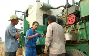 在麦收期间派出技术人员深入农村,向农民讲解农业机械的维修与保养,受到农民称赞。图为技术人员在我国小麦主产区河南省武陟县服务的情景。
